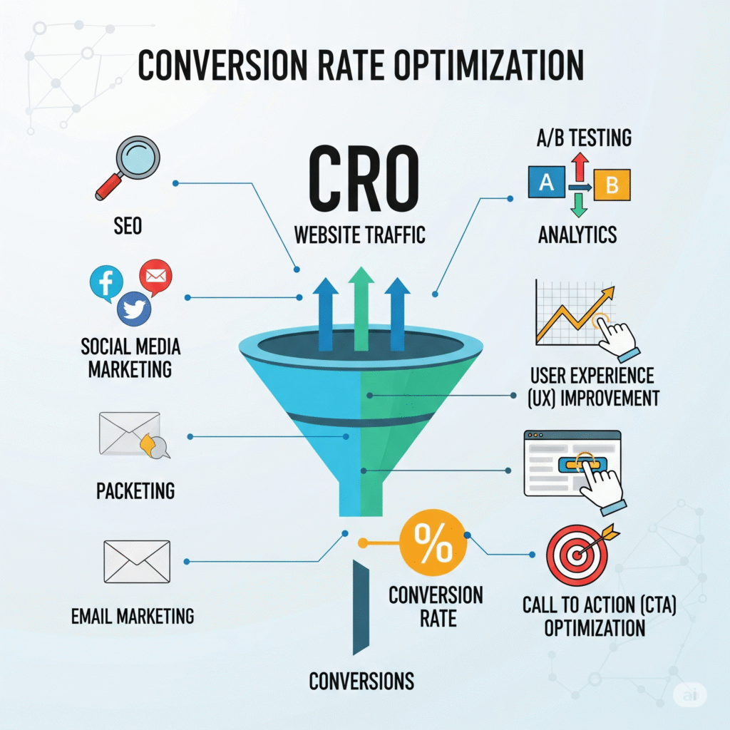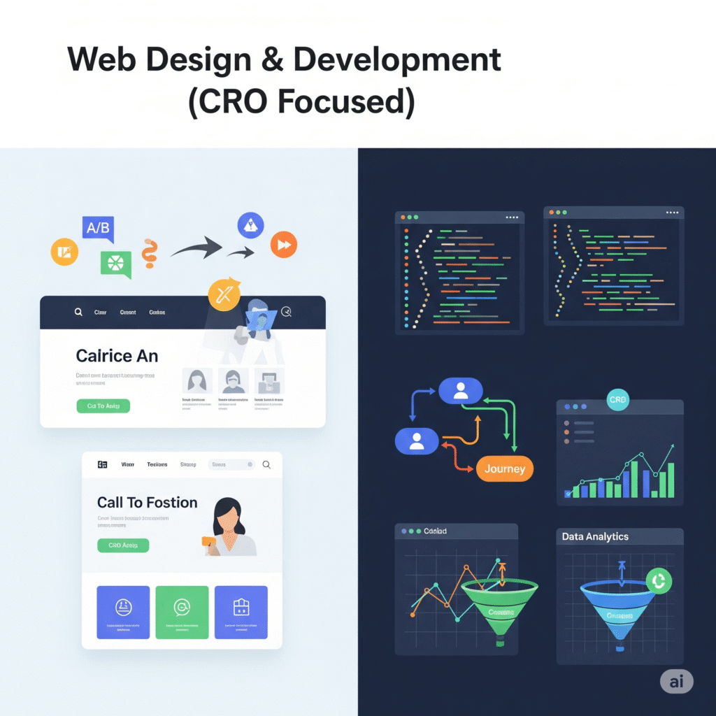 Funnel audits, heatmaps, A/B testing, UX fixes, offer architecture.