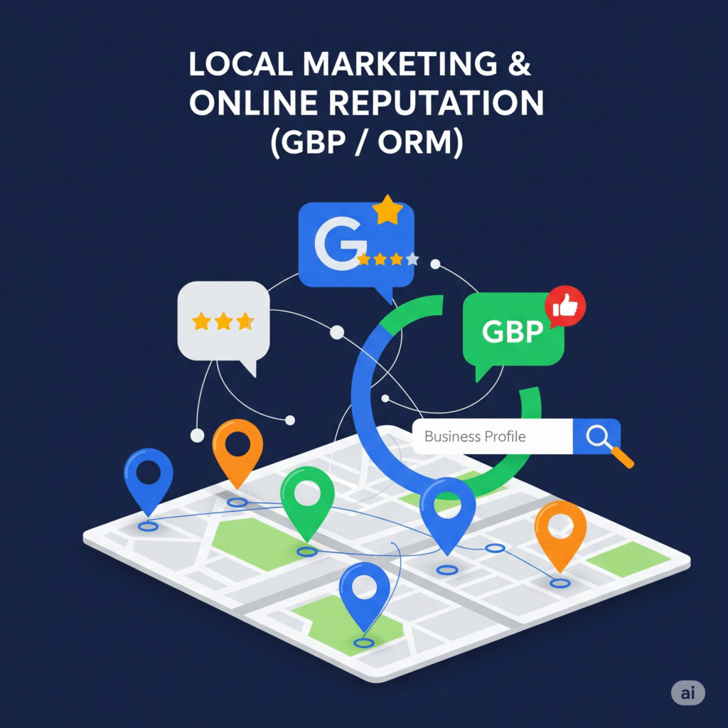 Google Business Profile optimisation, citation building, review strategy, reputation repair.