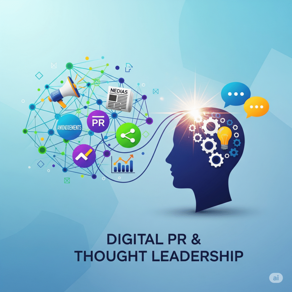Press outreach, guest articles, thought reports, podcast placements, LinkedIn strategy.