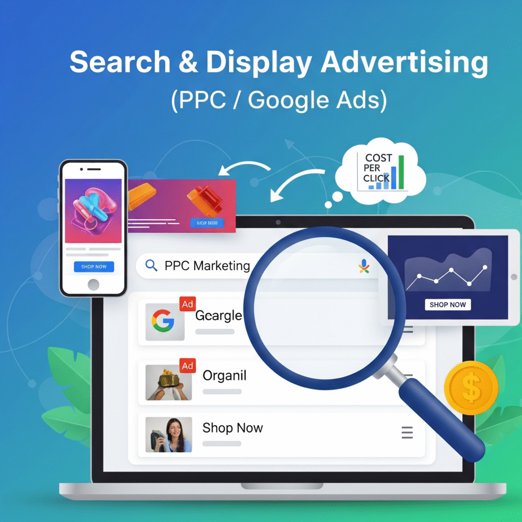 Shopify/Woo setup, Google Shopping, marketplace SEO (Amazon/Flipkart), email/SMS retention.